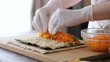 A Japanese woman making sushi rolls with rubber gloves at home.
