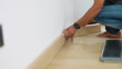 Worker installing the baseboard while renovating floor