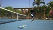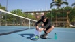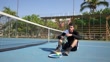 Jeune joueur de tennis se repose et boit de l’eau sur un court de tennis - Vidéo 4K