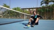 Young tennis player resting and drinking water on tennis court